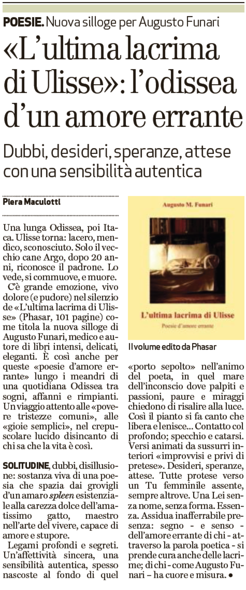 La poesia di Augusto M. Funari è poesia d’amore, amore indefinito e curioso, nostalgico e trasfigurato. È poesia che eleva un canto permeato di rammarichi, di nostalgia e, a volte, della stanca vitalità di chi ha tanto da ricordare, e ancora da sognare. In questi scritti l’Autore non smette mai di guardarsi indietro, di trovare nel passato la strada da percorrere e la forza di compren- dere le ragioni della sua inquietudine e del suo perenne ramma- rico per le cose che non sono ma che sarebbero potute essere. Vi si ritrova, martellante e sublimata, la presenza trasfigurata di una donna che non necessariamente è stata incontrata. Si percepisce l’amore verso le piccole cose di tutti i giorni, quelle che ci aiutano a vivere, ma, soprattutto, si percepisce il grande amore per i luoghi dell'infanzia, ancora così presenti nella vita di un adulto che avrebbe voluto rimanere bambino.